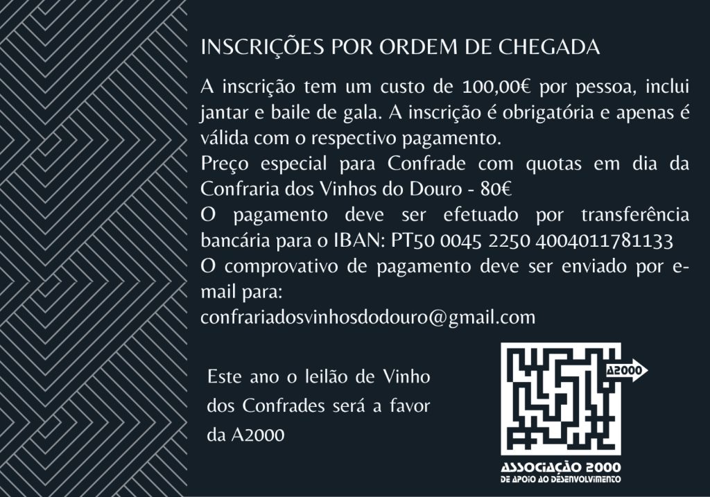Inscrições por ordem de chegada, após pagamento por transferência bancária (IBAN: PT50 0045 2250 4004011781133). Envie o comprovativo para confrariadosvinhosdodouro@gmail.com.